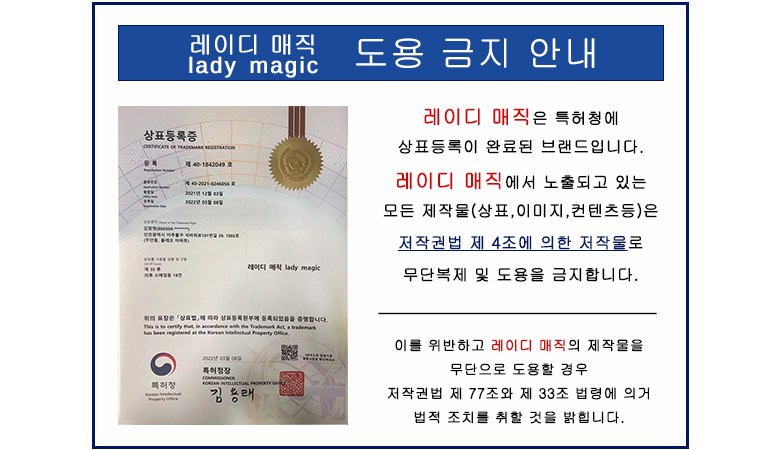 | 치수 | 컨텐츠 참조 | 제조자(수입자) | 레이디매직 협력업체(업체 정보 미제공으로 정확한 제조,수입사 알 수 없음) |
