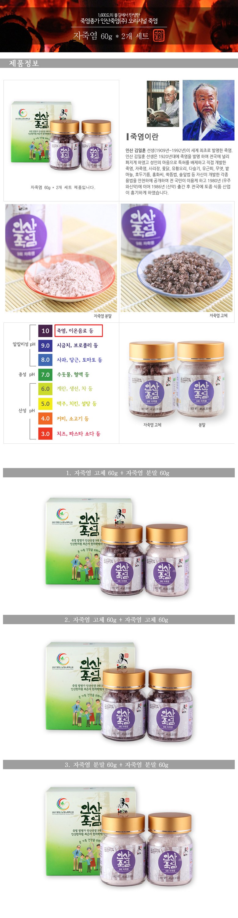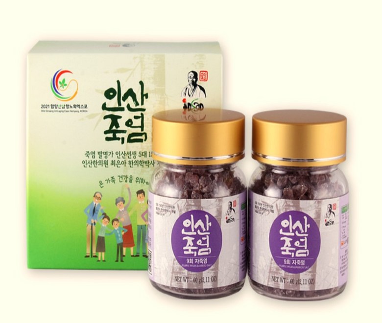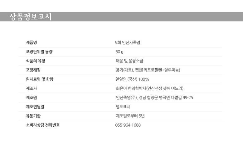 | 생산자 및 소재지 | 최은아 한의학박사(인산선생 셋째 며느리) / 인산죽염(주), 경남 함양군 다볕길 99-25 | 제조연월일, 소비기한 또는 품질유지기한 | 제조일로부터 5년 |