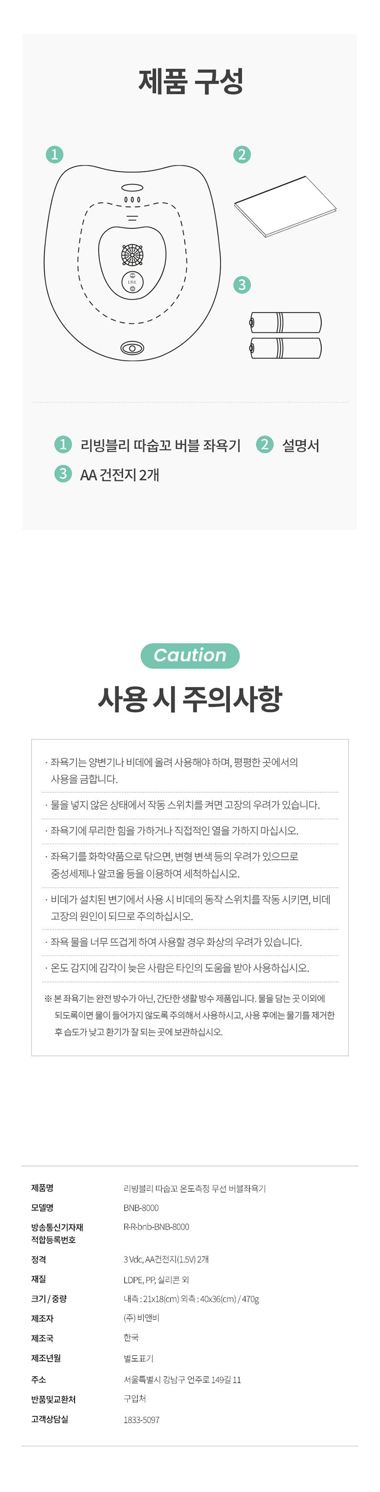 | 품명 및 모델명 | 리빙블리 따숩꼬 온도측정 무선 버블좌욕기 / BNB-8000 | KC 인증정보 | 본품: R-R-bnb-BNB-8000 / 건전지: B052L001-7122E |