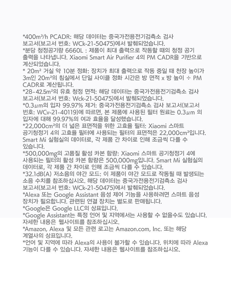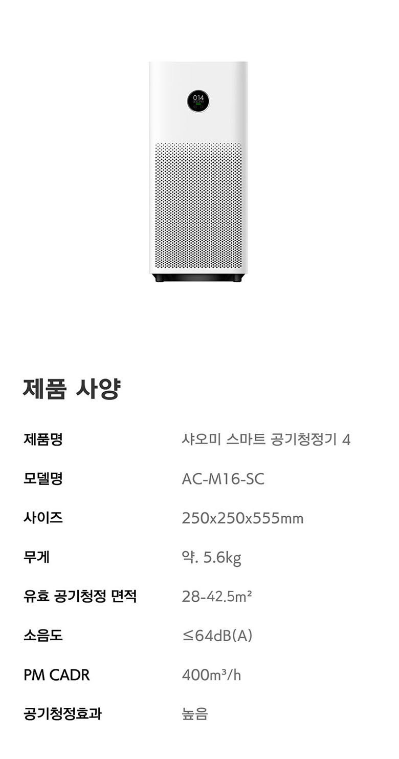 | 품명 및 모델명 | 샤오미 스마트 공기청정기 4 / AC-M16-SC | KC 인증정보 | XU070566-21001A, R-R-ZMi-AC-M16-SC |