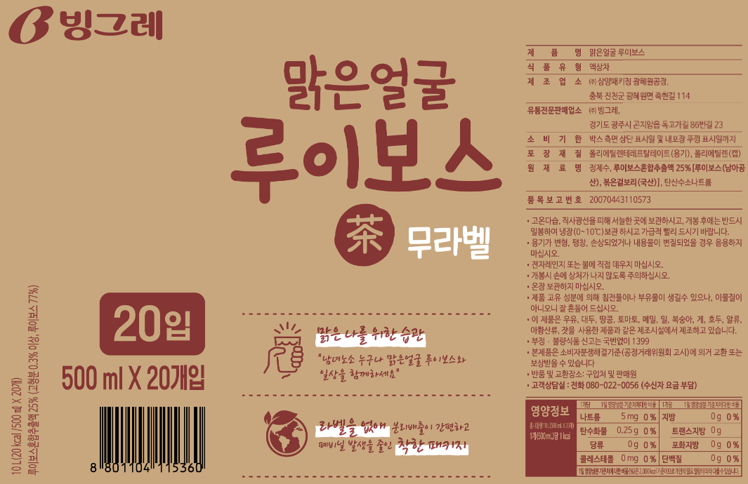 | 포장단위별 내용물의 용량(중량), 수량 | 500ml x 20개입 | 원재료명 및 함량 | 컨텐츠 참조 |