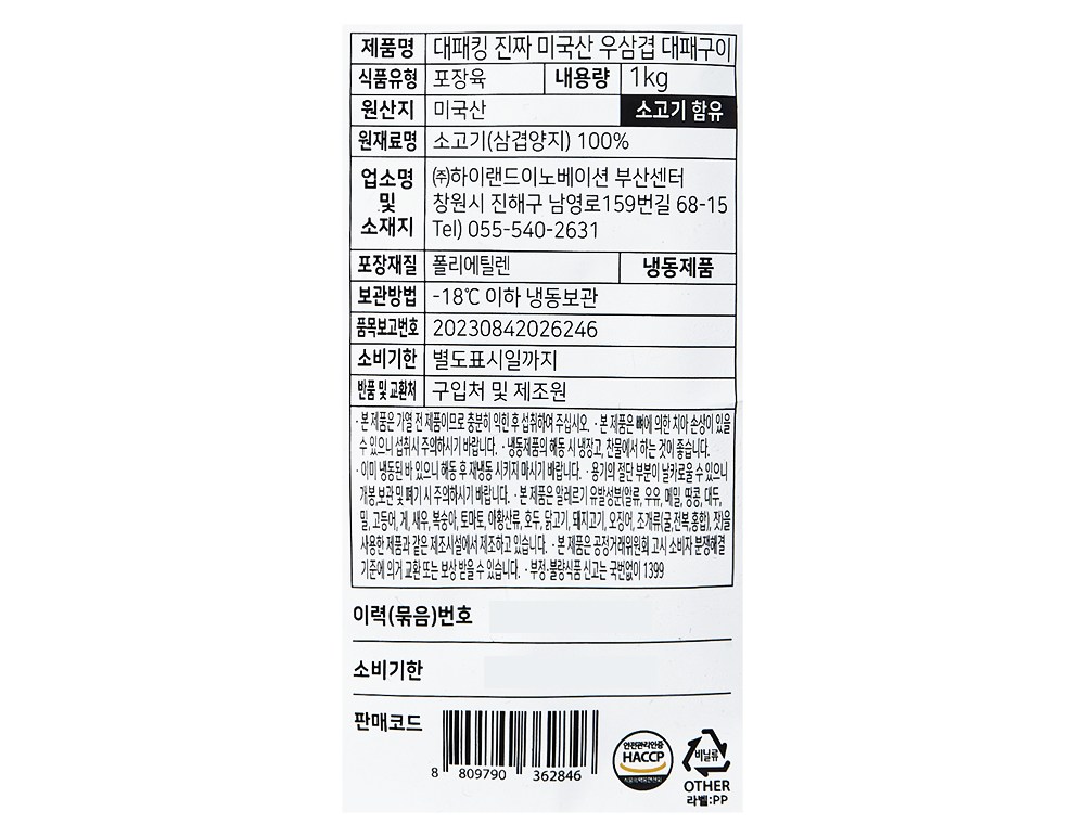 | 제조연월일, 소비기한 또는 품질유지기한 | 소비기한(또는 유통기한) : 2027년 01월 29일 이거나 그 이후인 상품 제조년월일 : 2026년 01월 30일 이후인 제조상품 | 세부 품목군별 표시사항 | 축산물 등급표시 : 해당 없음 / 이력번호 표시유무 : 이력번호 표시제품임 |