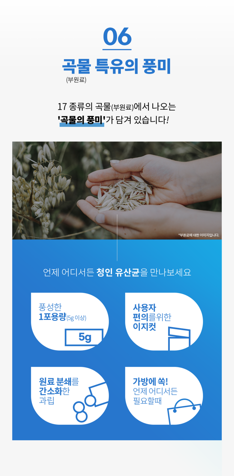| 소비기한 및 보관방법 | 소비기한(또는 유통기한) : 2027년 08월 18일 이거나 그 이후인 상품 제조년월일 : 2025년 08월 19일 이후인 제조상품 보관방법: 컨텐츠 참조 | 포장단위별 내용물의 용량(중량), 수량 | 150g(5g X 30포) |