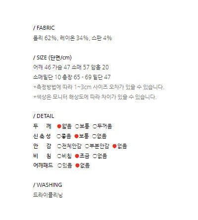 | 제품 소재 | 폴리 62%, 레이온 34%, 스판 4% | 색상 | 블랙 |