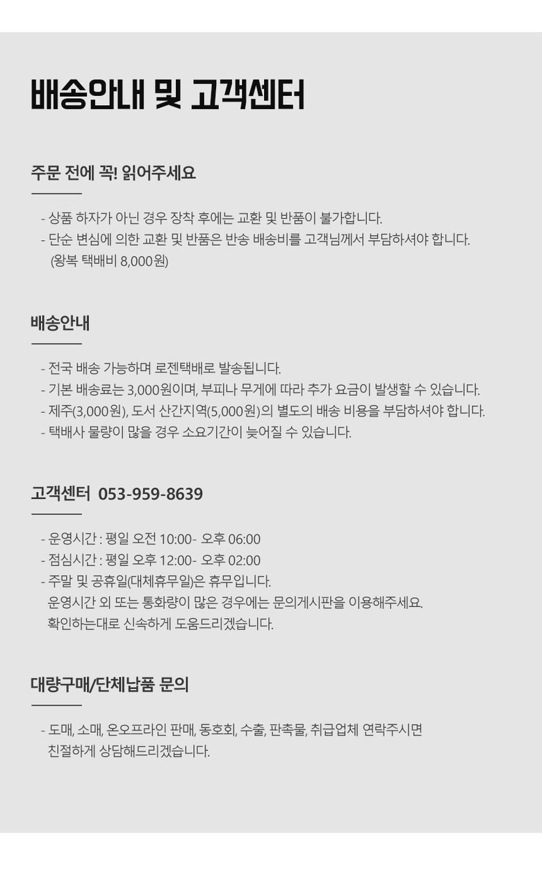 | 배송방법 | 주문제작 | 배송비 | 3,000원 · 도서산간 추가 배송비 - 제주 지역: 3,000원 - 도서산간 지역: 5,000원 |