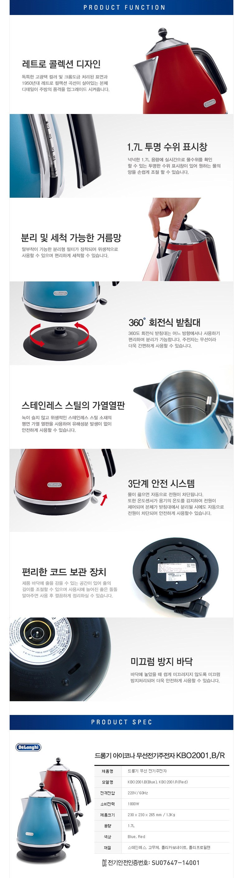 | 품명 및 모델명 | 드롱기 아이코나 전기주전자 KBO2001.B | KC 인증정보 | SU07647-14001 |