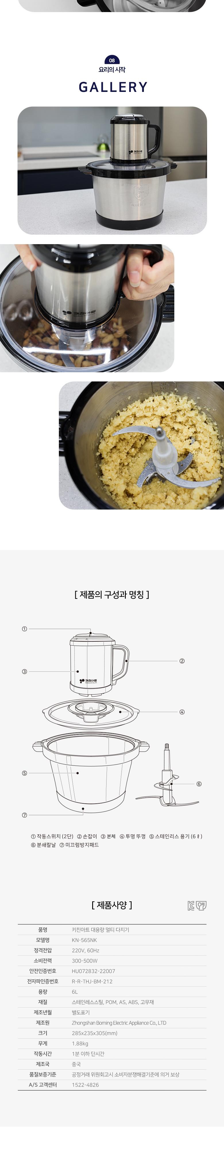 | 품명 및 모델명 | 키친아트 대용량 6L 멀티 다지기 304스텐용 KN-565NK | KC 인증정보 | HU072832-22007B |