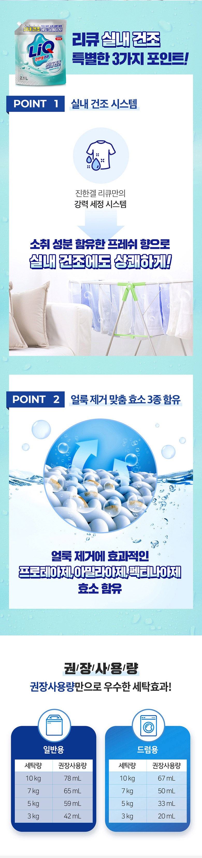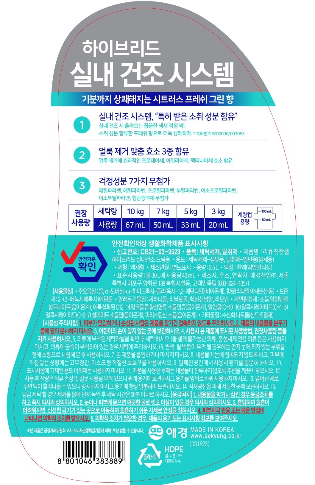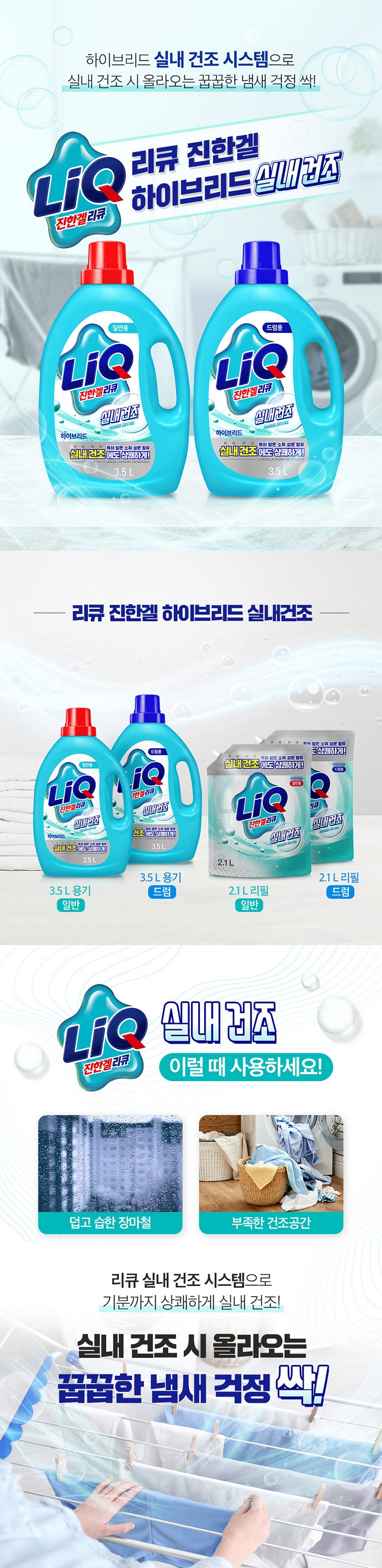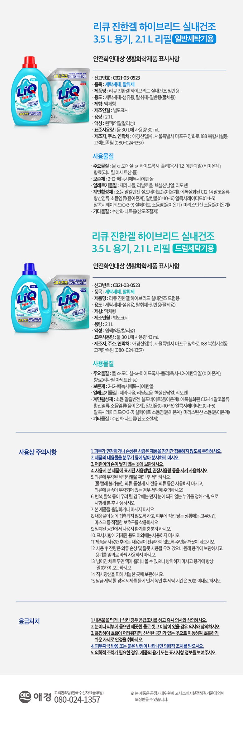 | 품목 및 제품명 | 탈취제,세탁세제/리큐 진한겔 하이브리드 실내건조 드럼용 | 용도(표백제의 경우 계열을 함께표시) 및 제형 | 일반용-물체용,섬유용/비분사형-액체형 |