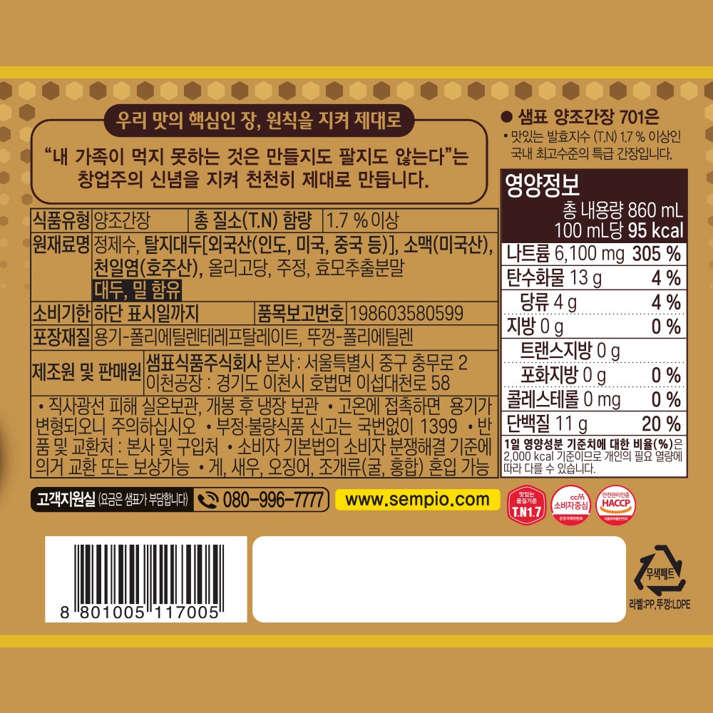 | 제품명 | 양조간장 701 | 식품의 유형 | 컨텐츠 참조 |