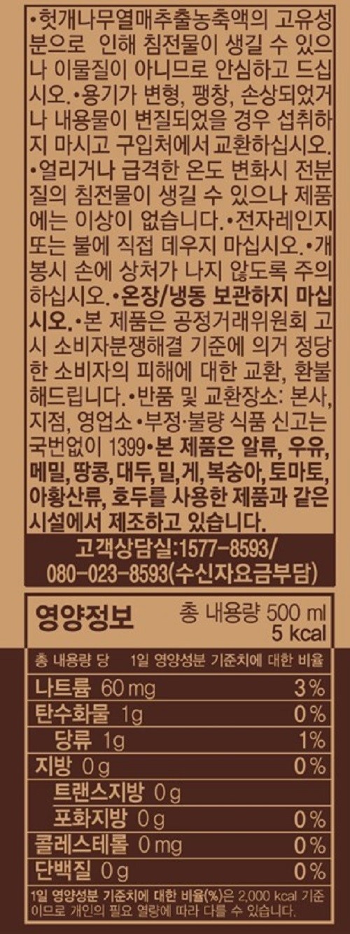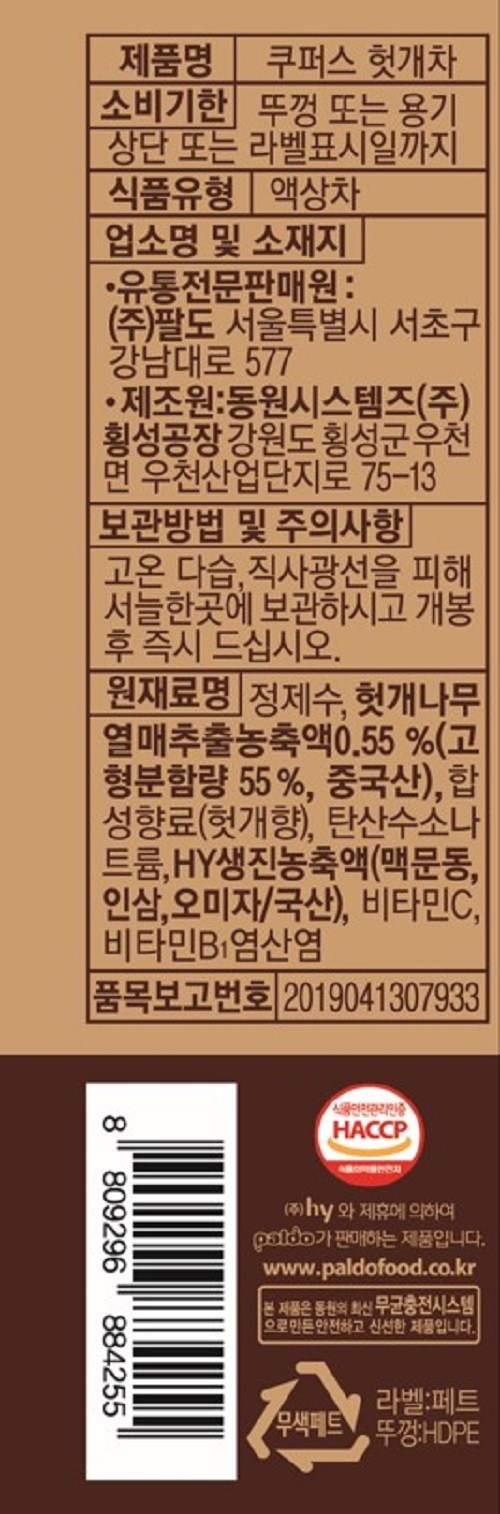 | 제품명 | 팔도 쿠퍼스헛개차 | 식품의 유형 | 액상차 |