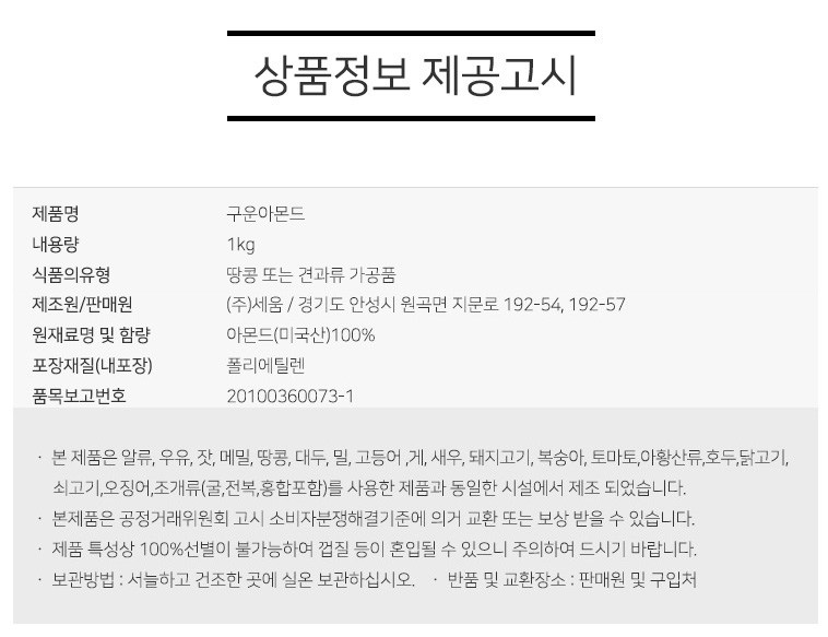 | 제품명 | 구운아몬드 | 식품의 유형 | 땅콩 또는 견과류 가공품 |