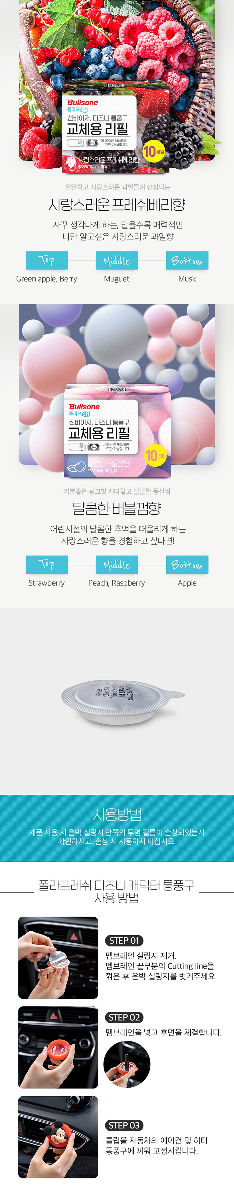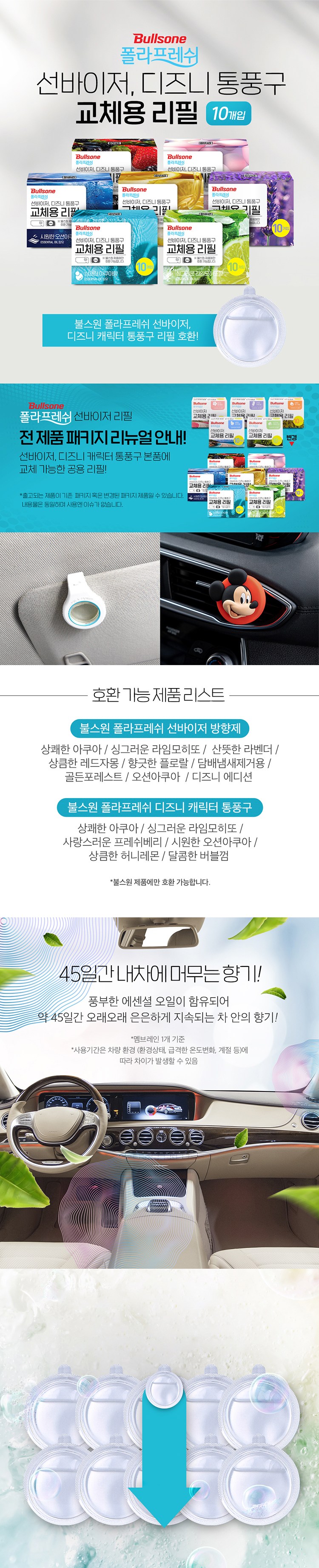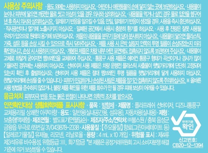 | 품목 및 제품명 | 방향제 / 폴라프레쉬 선바이저 디즈니통풍구 교체용리필 상쾌한 아쿠아향 | 용도(표백제의 경우 계열을 함께표시) 및 제형 | 자동차용-실내용,일반용-실내공간용,일반용-섬유용 / 비분사형-액체형 |