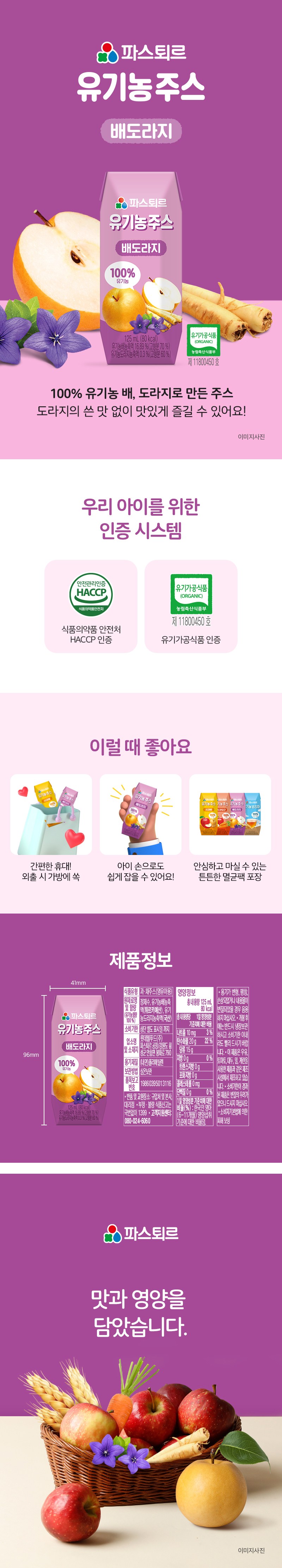 | 제품명 | 파스퇴르 유기농주스 배도라지 | 식품의 유형 | 컨텐츠 참조 |