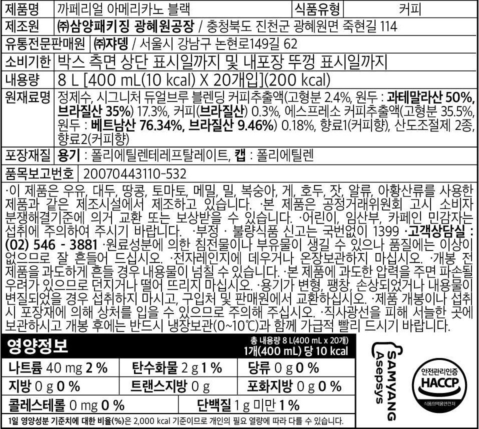 | 포장단위별 내용물의 용량(중량), 수량 | 400ml, 20개 | 원재료명 및 함량 | 컨텐츠 참조 |