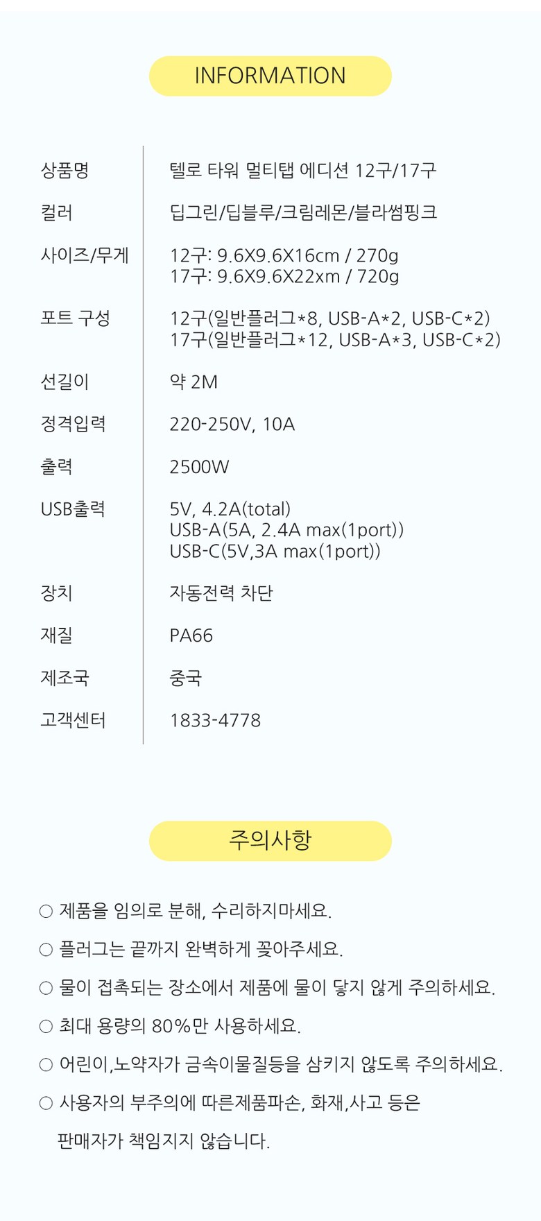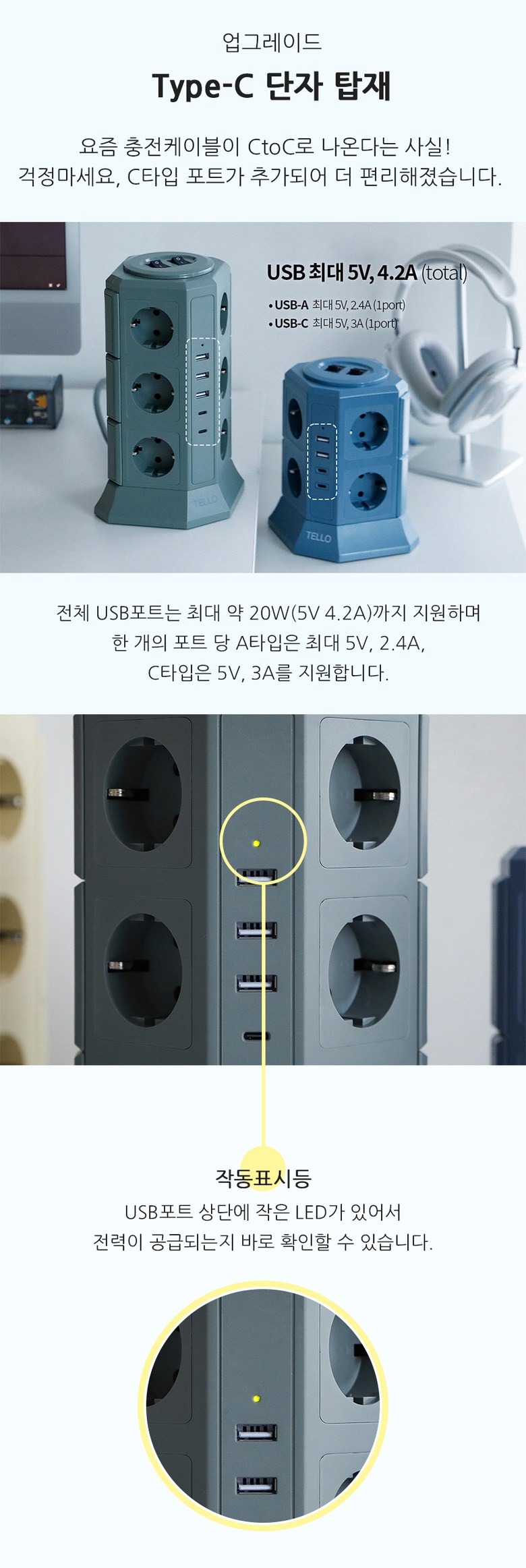 | 정격전압, 소비전력 | 10A, AC 250V, Max 2500 W USB Input: 220-250 Vac, 50/60 Hz, 0.5A; USB Output : 5 Vdc, 4.2 A(Total) USB-A Output: 5 Vdc, 2.5 A Max(1port) USB-C Output: 5 Vdc, 3 A Max(1port) | 출시년월 | 2024.02 |