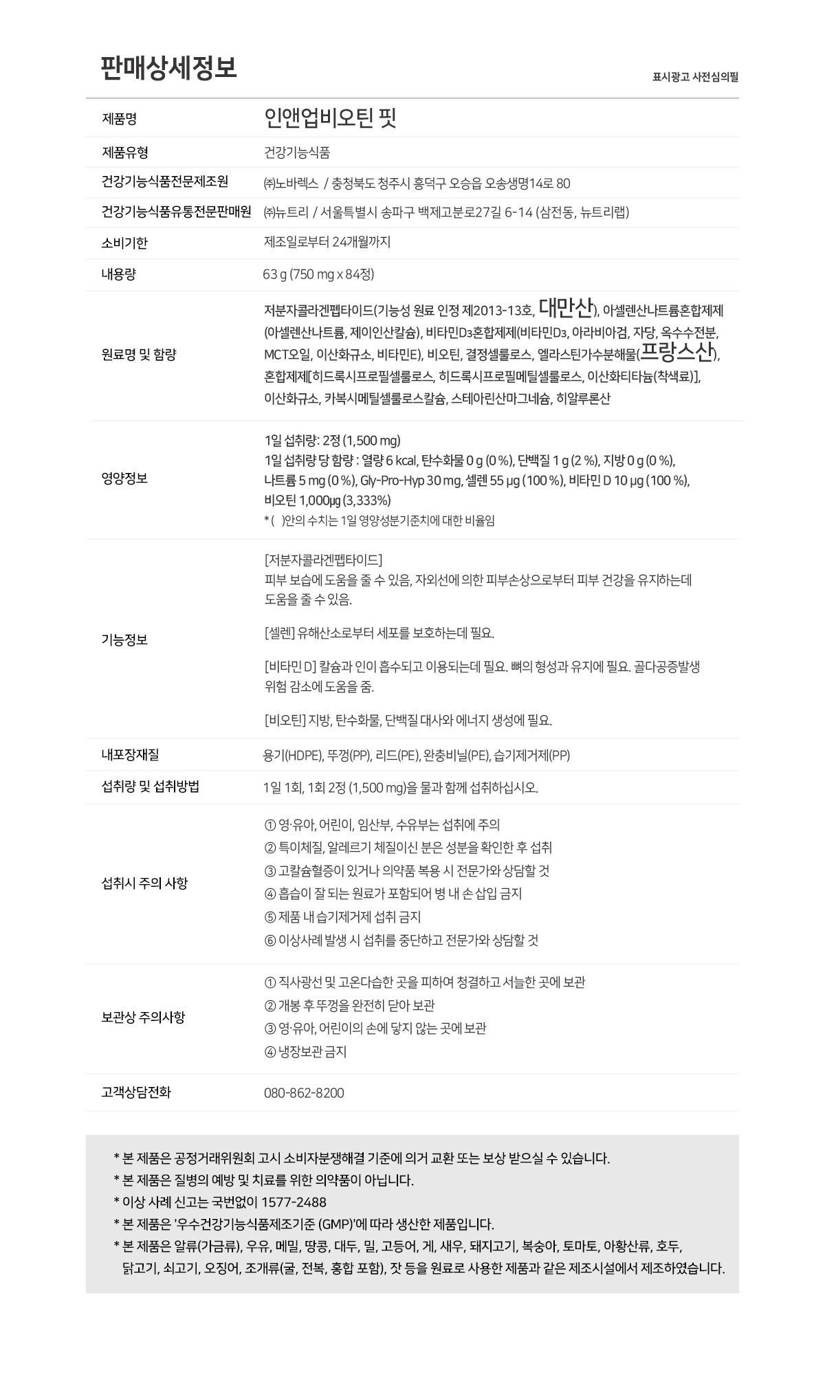 | 소비기한 및 보관방법 | 보관방법: 컨텐츠 참조 | 포장단위별 내용물의 용량(중량), 수량 | 84정 x 4개 |