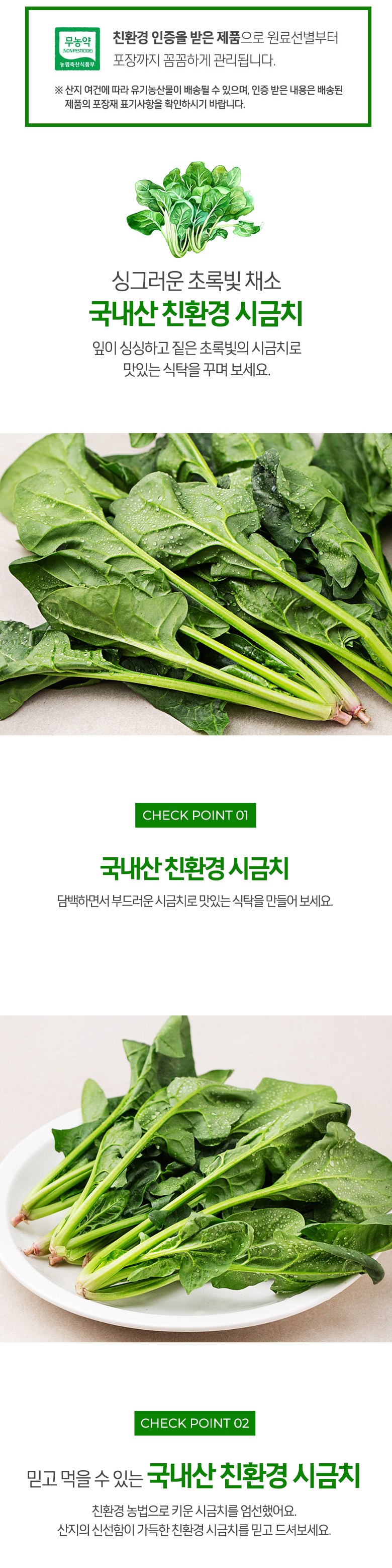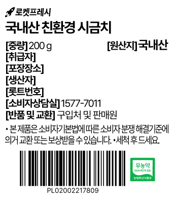 | 품목 또는 명칭 | 국내산 친환경 시금치 | 포장단위별 내용물의 용량(중량),수량,크기 | 200gx5개 |