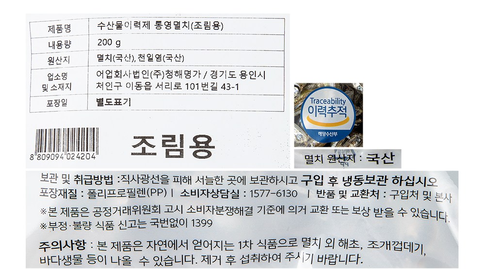 | 품목 또는 명칭 | 수산물이력제통영멸치 (조림용) | 포장단위별 내용물의 용량(중량),수량,크기 | 200g,1개 |