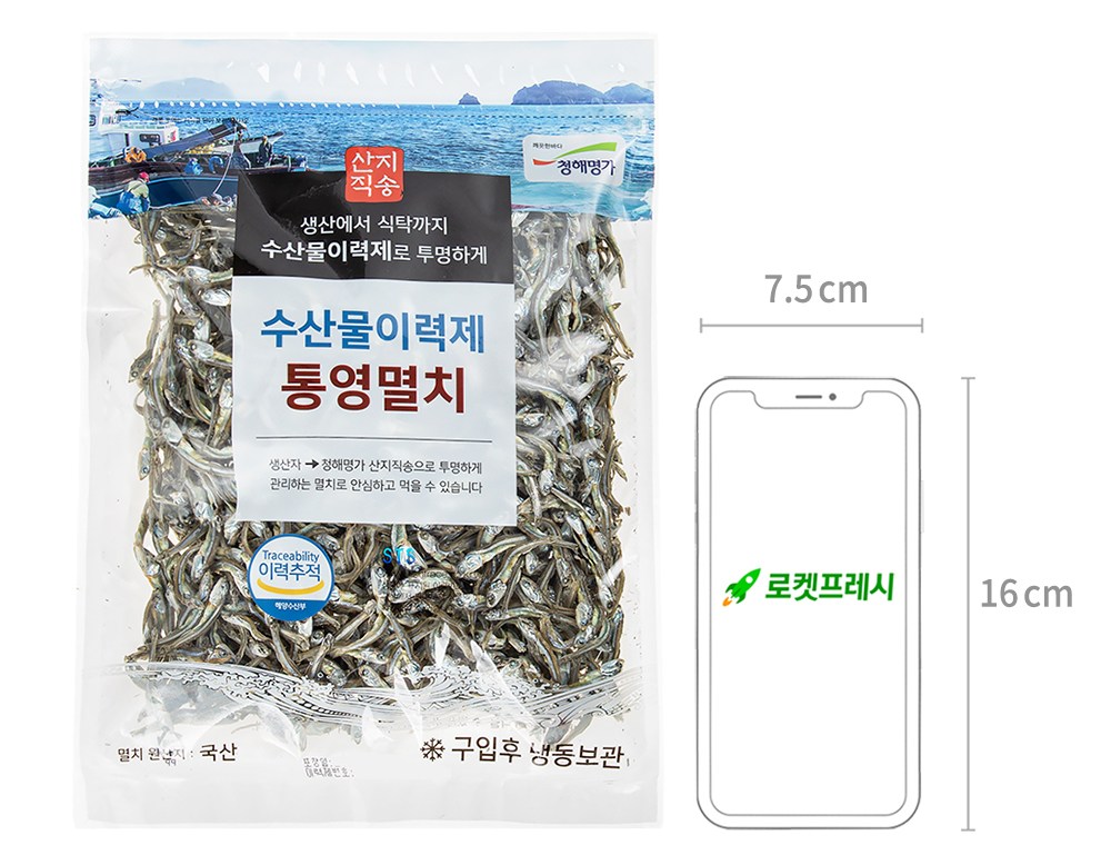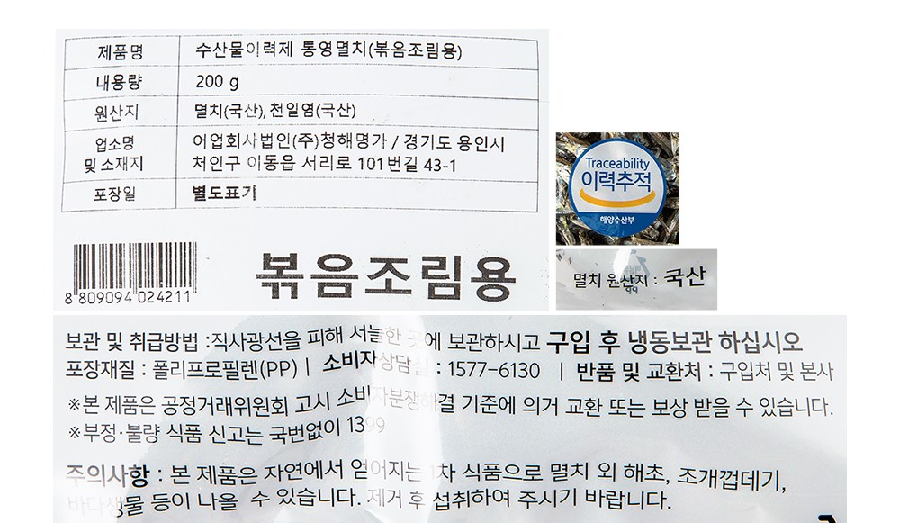 | 품목 또는 명칭 | 수산물이력제통영멸치 (볶음조림용) | 포장단위별 내용물의 용량(중량),수량,크기 | 200g x 4개,1개 |