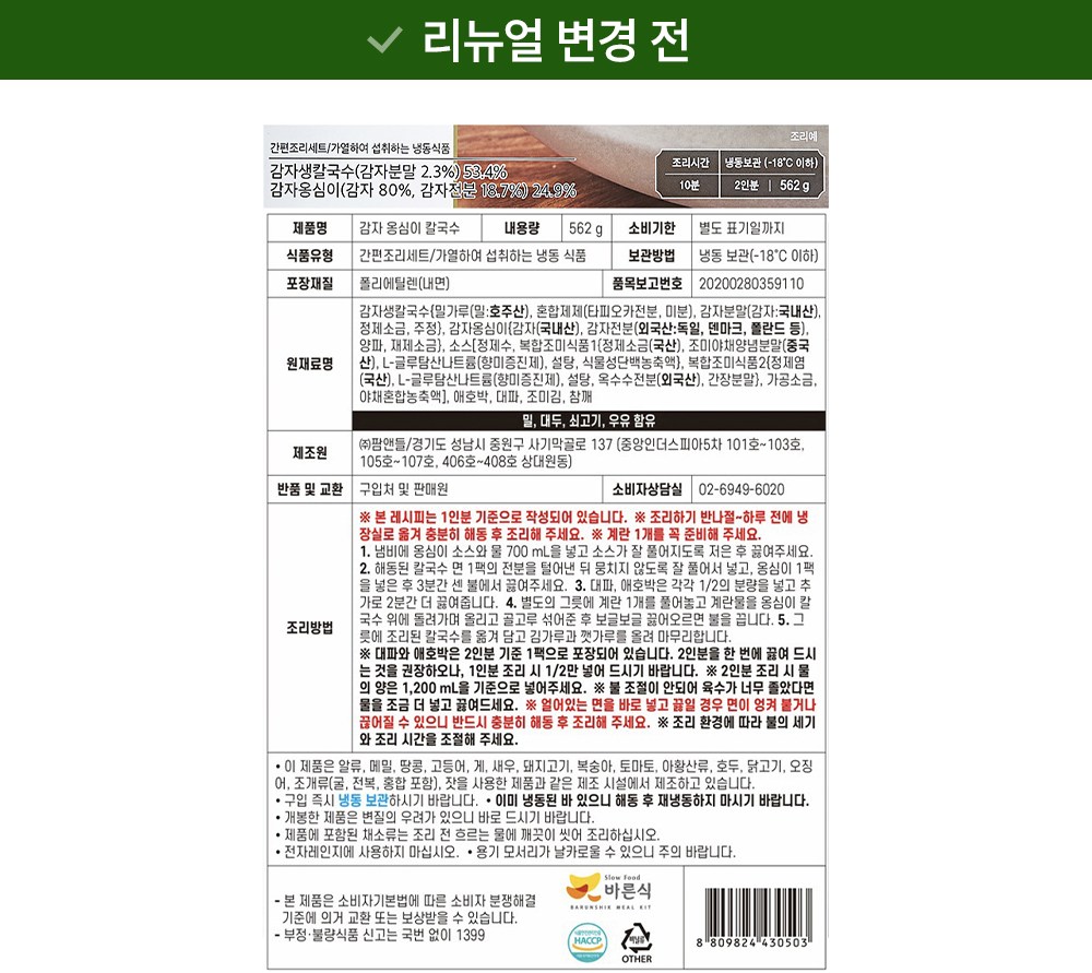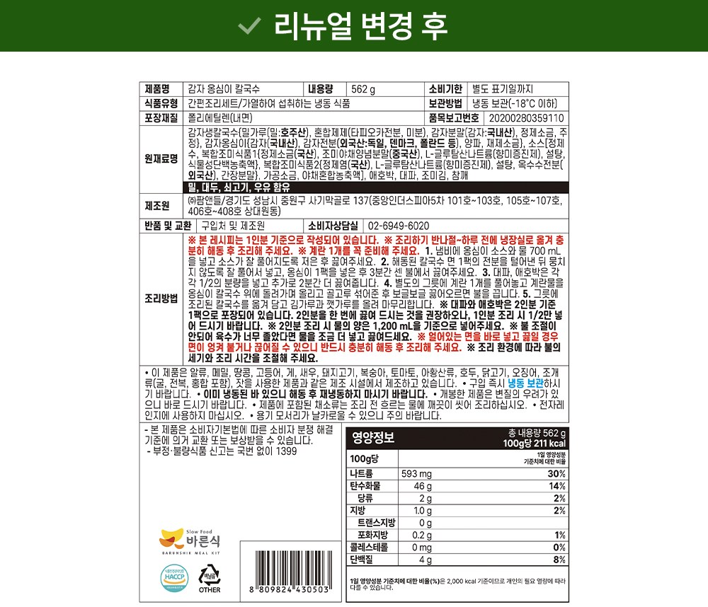 | 포장단위별 내용물의 용량(중량), 수량 | 562g x 2개 | 원재료명 및 함량 | 컨텐츠 참조 |