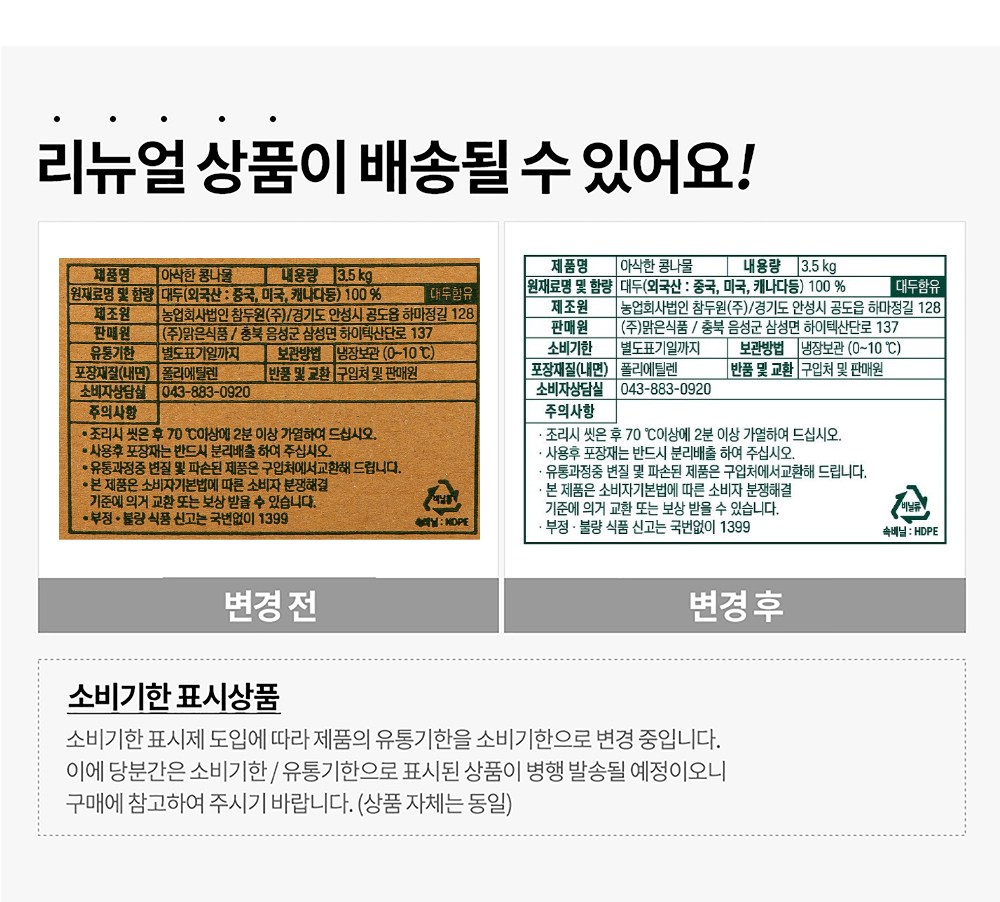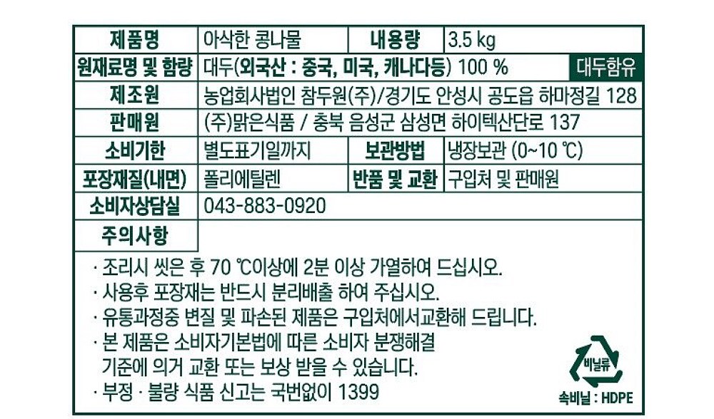 | 품목 또는 명칭 | 아삭한 콩나물 | 포장단위별 내용물의 용량(중량),수량,크기 | 3.5kg, 1개 |