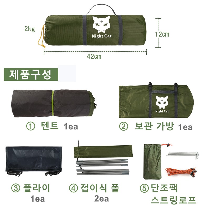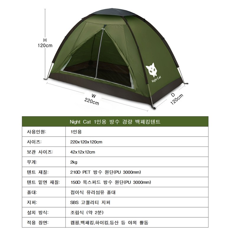 Night Cat 1인용 경량 돔형 텐트 알파인 백패킹텐트 120 x 220cm 방수 PU3000mm