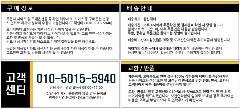 - ㆍ모니터 해상도의 차이로 인해 색상이나 이미지가 실제와 달라, 고객이 단순 변심으로 교환/반품을 무료로 요청하는 경우