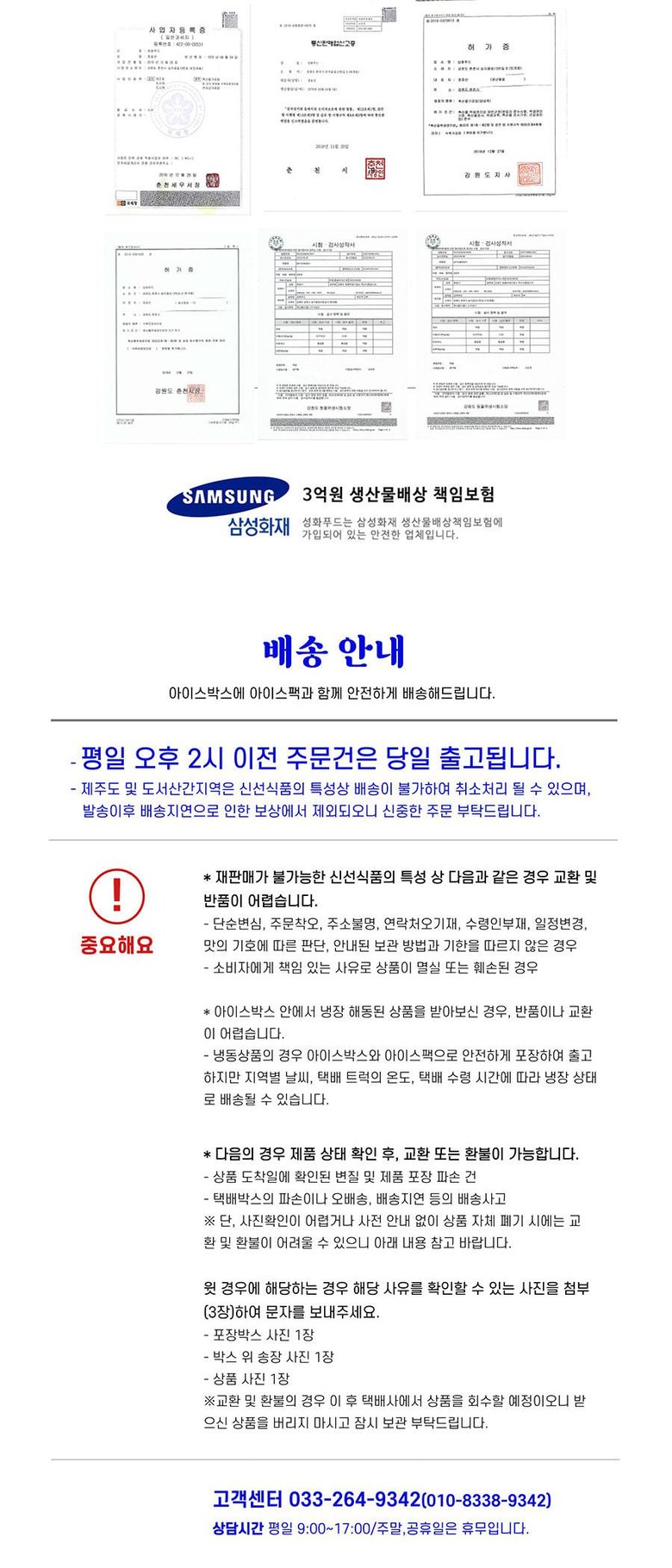 | 배송방법 | 신선/냉장/냉동 | 배송비 | 무료배송 - 도서산간 지역 배송불가 |