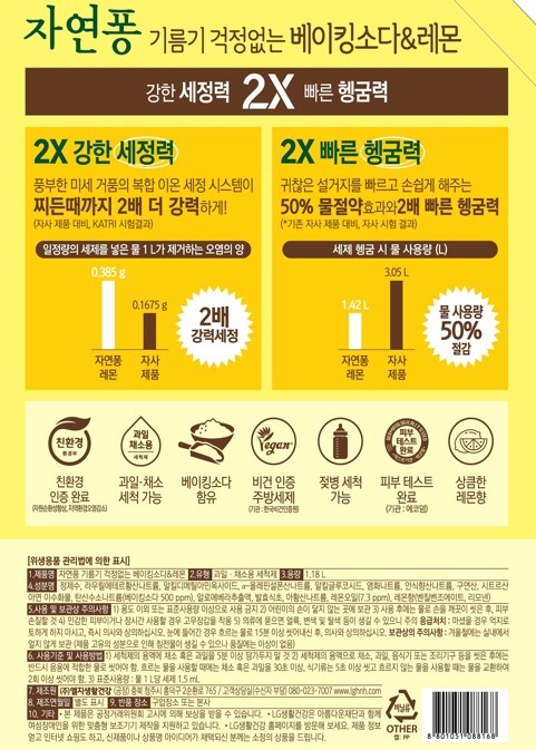 | 품명 및 모델명 | 자연퐁 기름기 걱정없는 베이킹소다 & 레몬 | 인증/허가 사항 | 위생용품 |