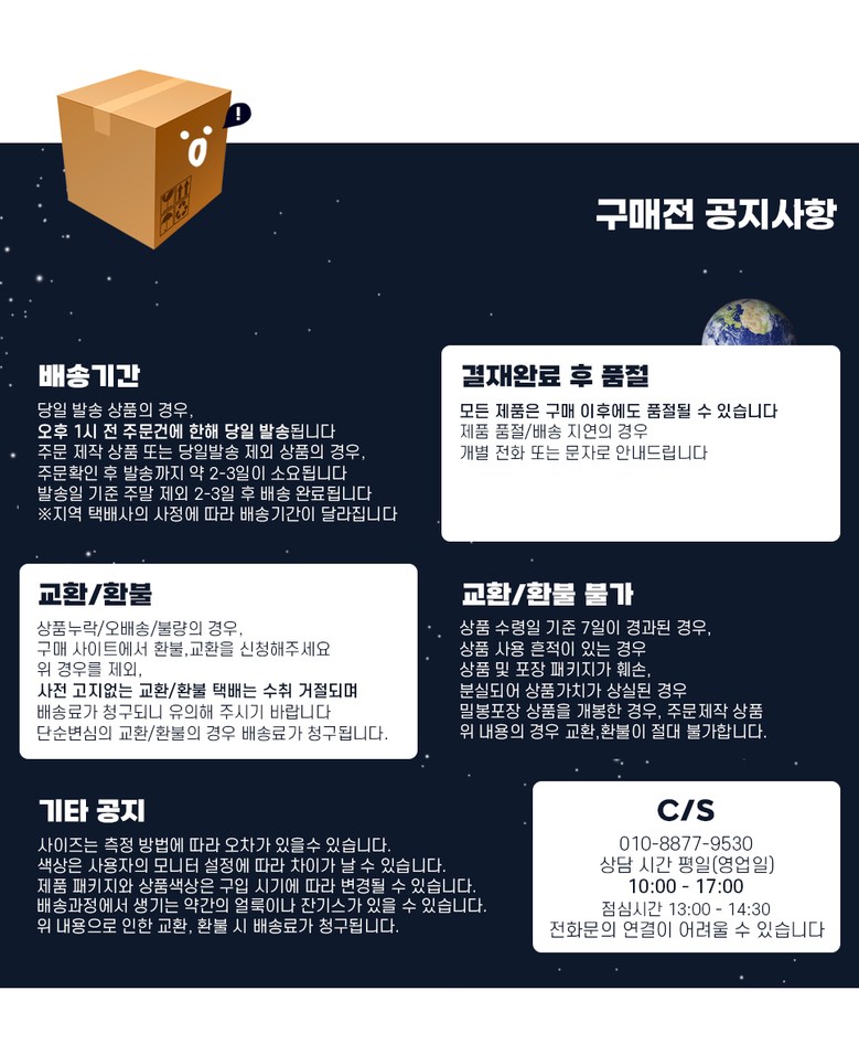 - ㆍ모니터 해상도의 차이로 인해 색상이나 이미지가 실제와 달라, 고객이 단순 변심으로 교환/반품을 무료로 요청하는 경우