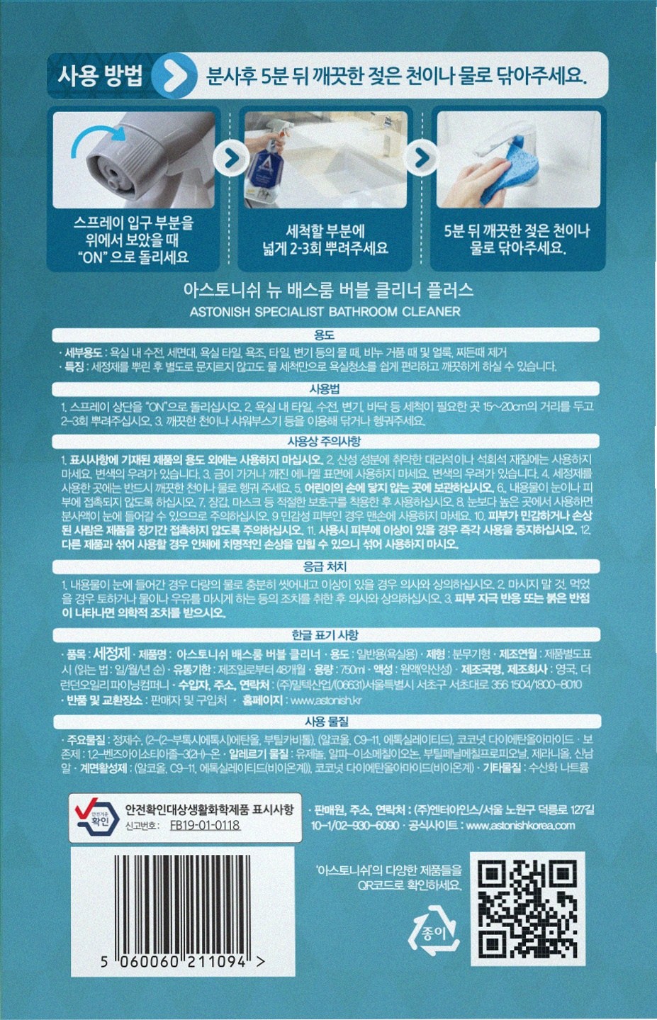 | 품목 및 제품명 | 세정제 / 아스토니쉬 배스룸 버블 클리너 | 용도(표백제의 경우 계열을 함께표시) 및 제형 | 일반용 (욕실용) / 분무기형 |