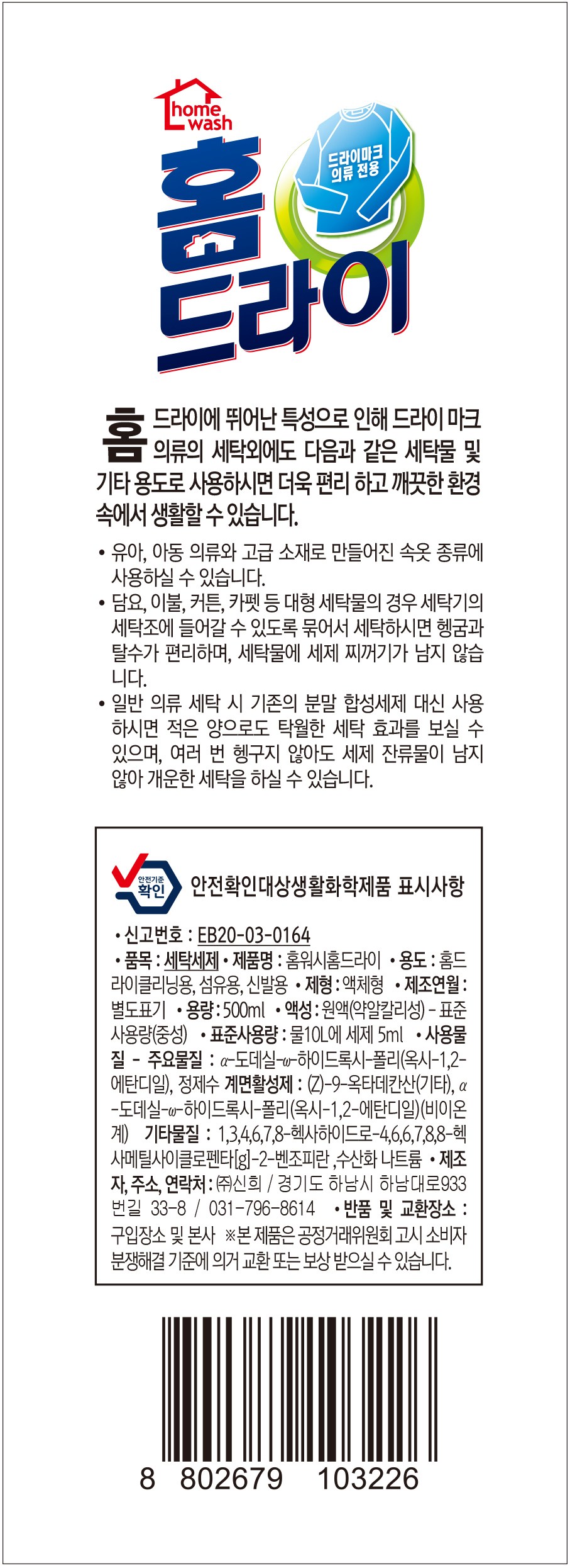 | 품목 및 제품명 | 세탁세제 / 홈워시 홈드라이 | 용도(표백제의 경우 계열을 함께표시) 및 제형 | 신발용,홈드라이클리닝용,섬유용 / 액체형 |