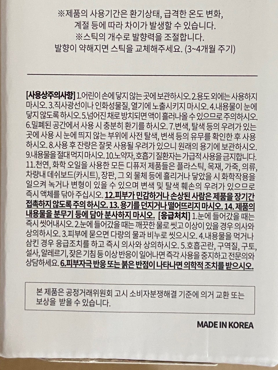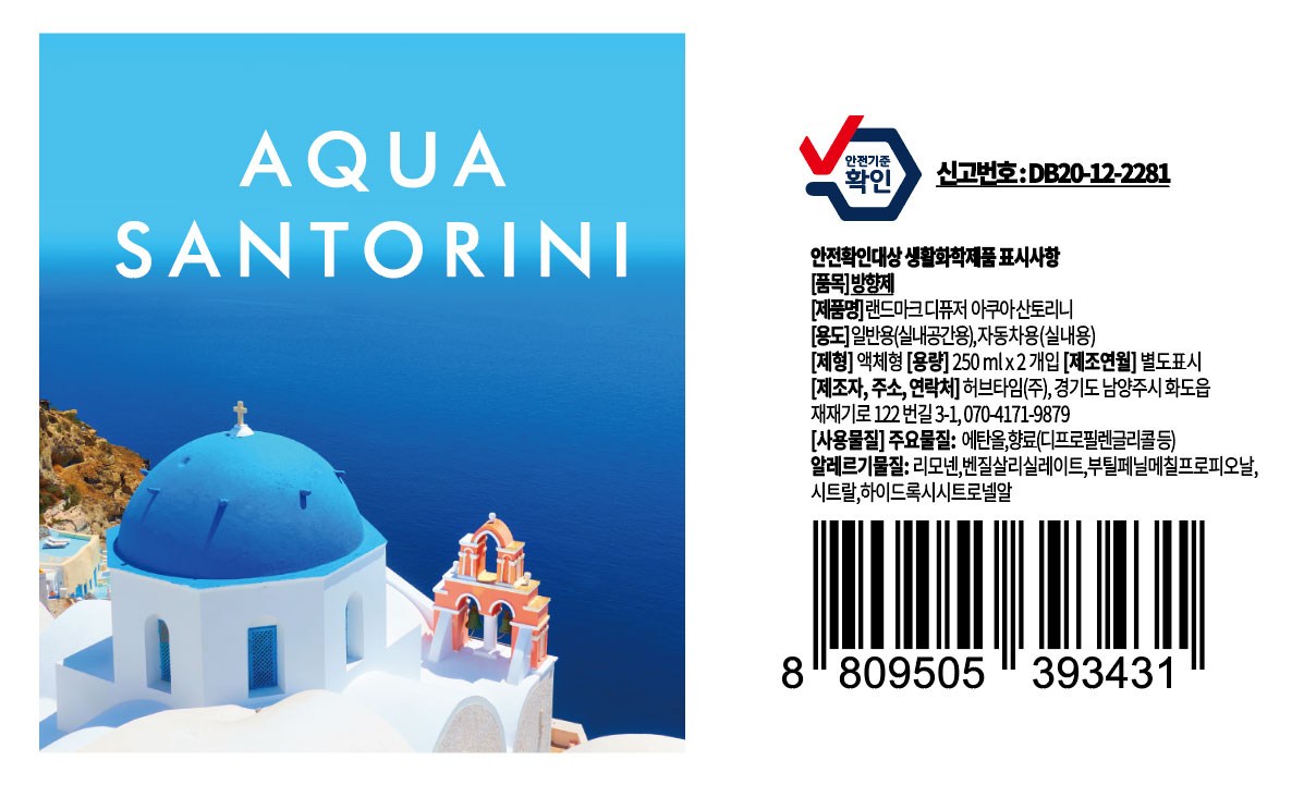 | 품목 및 제품명 | 방향제 / 랜드마크 디퓨저 아쿠아 산토리니 | 용도(표백제의 경우 계열을 함께표시) 및 제형 | 자동차용-실내용,일반용-실내공간용 / 비분사형-액체형 |