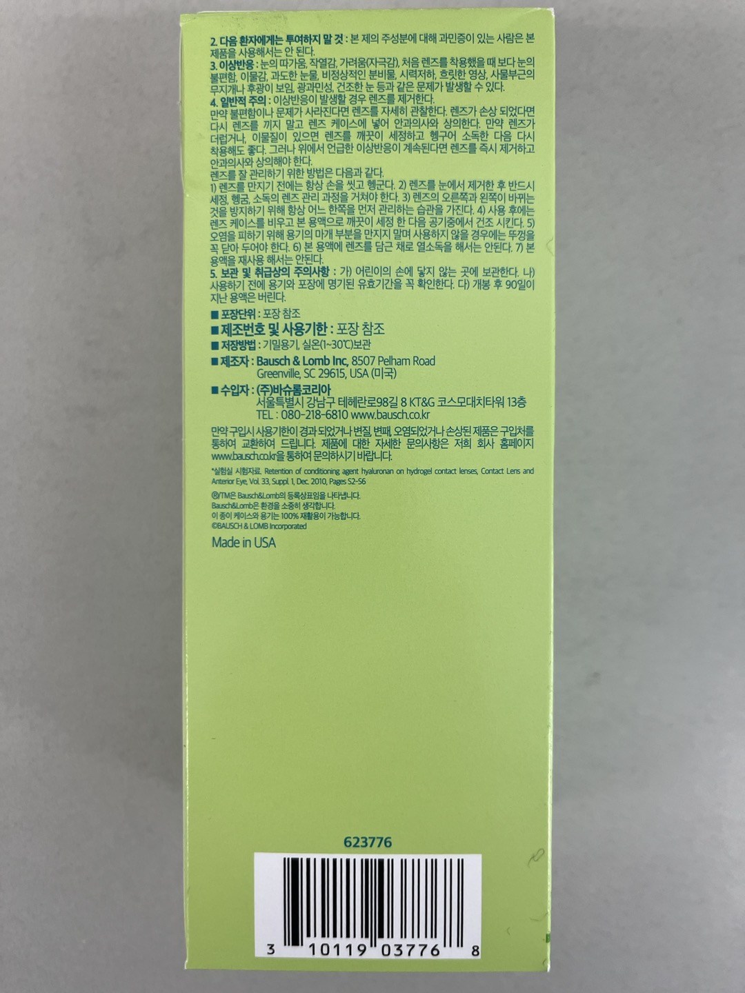 | 제조국(원산지) | 미국 | 제조자(수입자) | 다목적용액, 렌즈 케이스 : Bausch & Lomb inc, / (주)바슈롬코리아 |