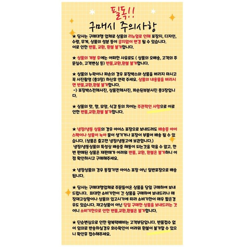 - ㆍ모니터 해상도의 차이로 인해 색상이나 이미지가 실제와 달라, 고객이 단순 변심으로 교환/반품을 무료로 요청하는 경우