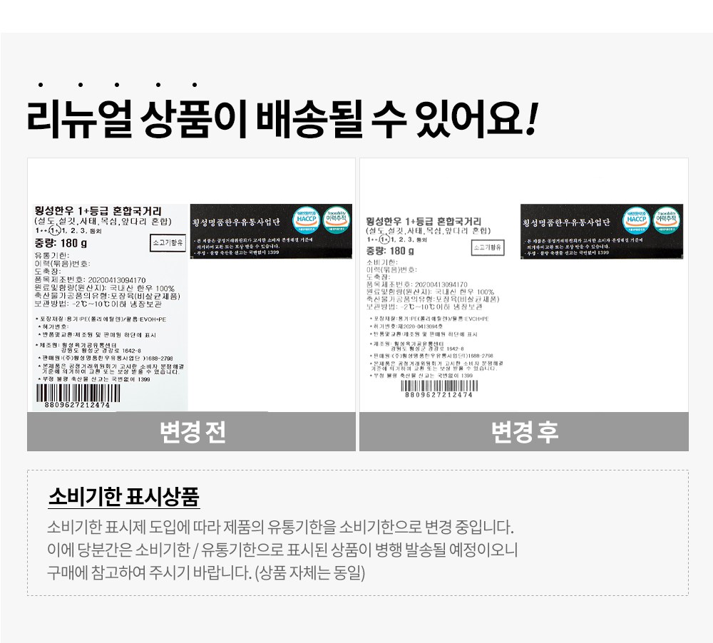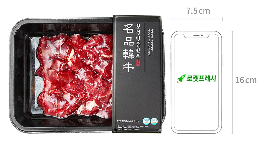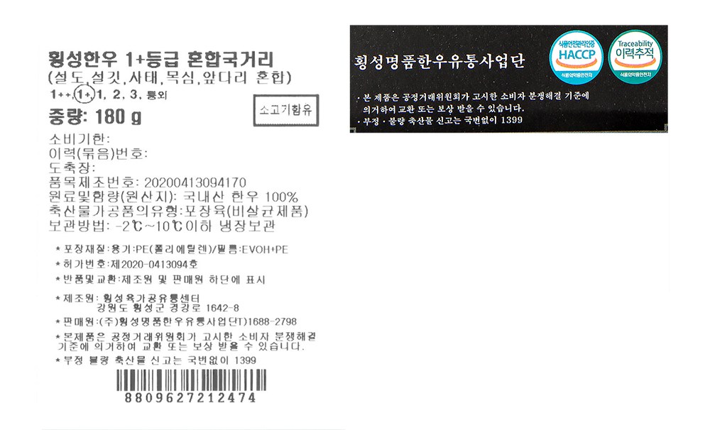| 품목 또는 명칭 | 횡성한우 1+등급 혼합국거리 | 포장단위별 내용물의 용량(중량),수량,크기 | 180g, 1개 |