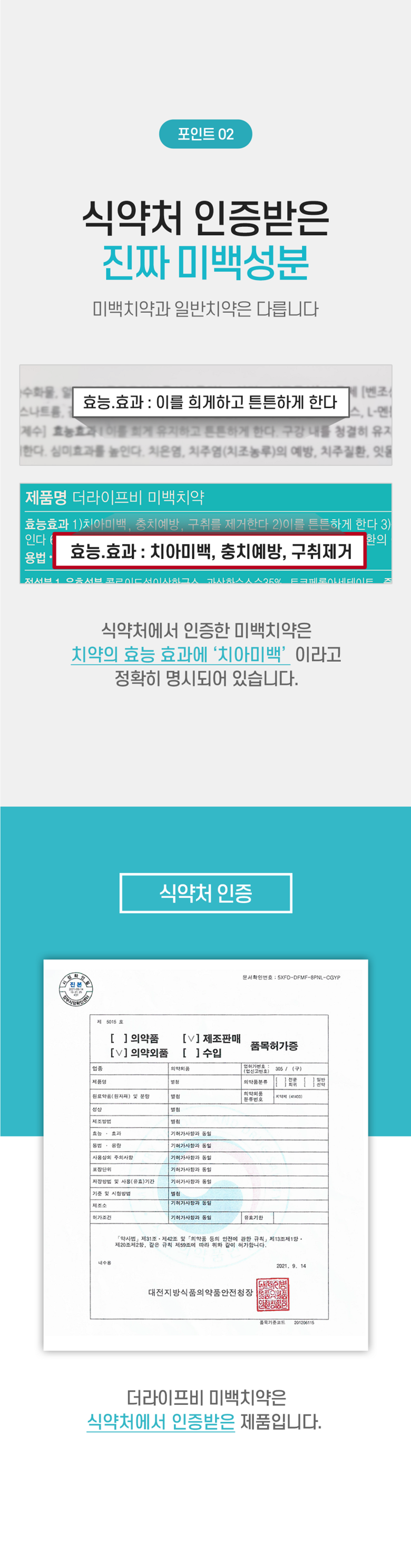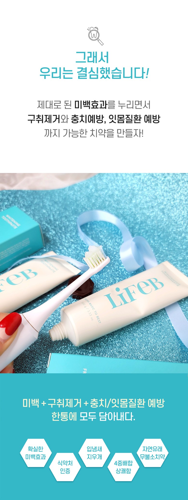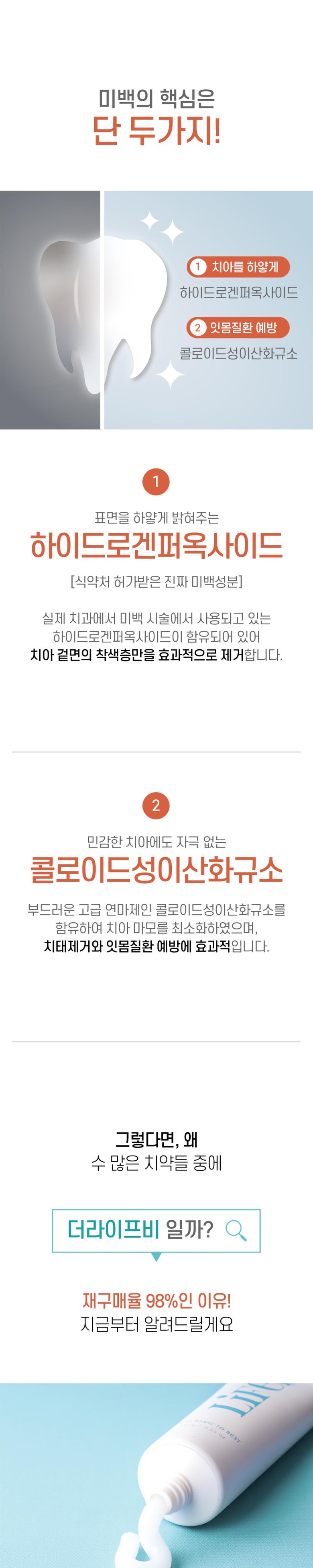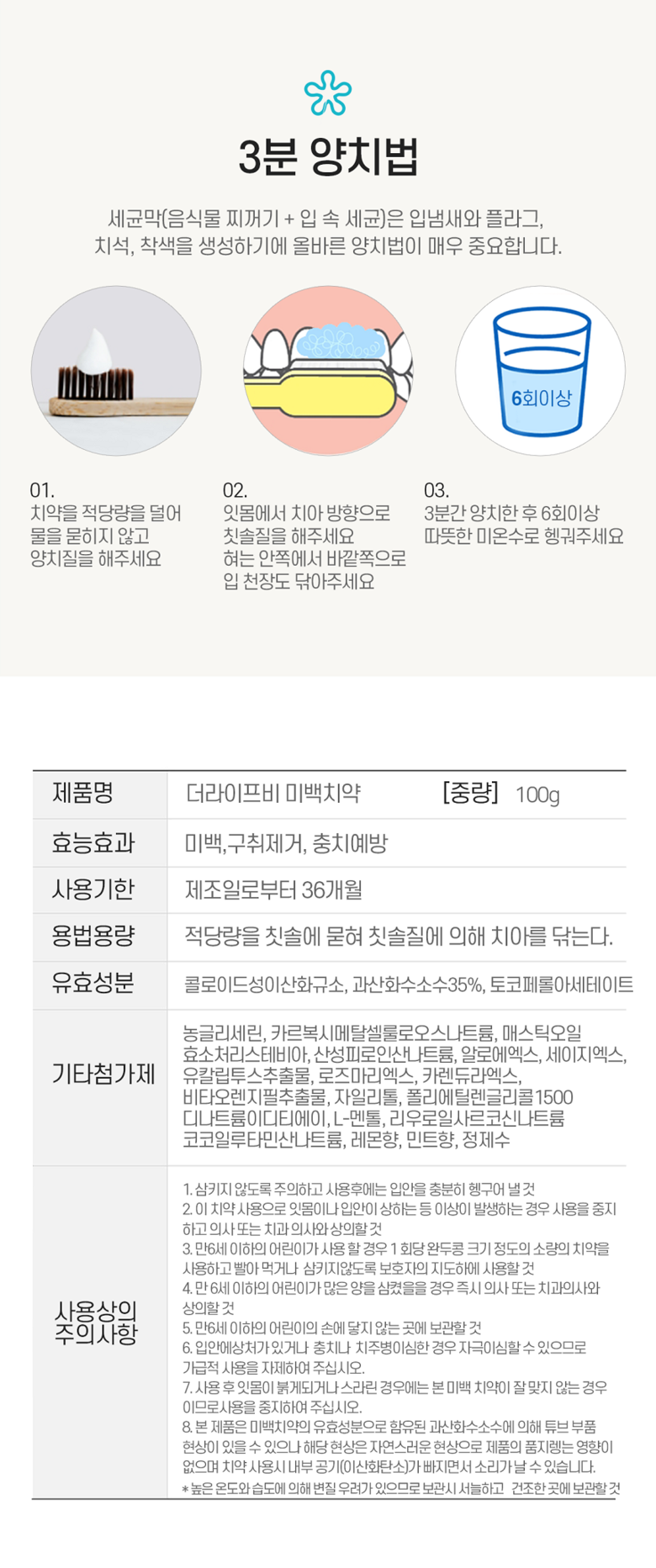 | 품명 및 모델명 | 더라이프비 미백치약 100g | 인증/허가 사항 | 미백치약 식약처 인증완료 |
