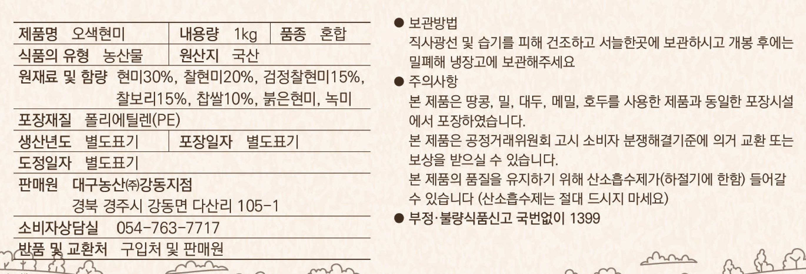 | 품목 또는 명칭 | 오색현미 | 포장단위별 내용물의 용량(중량),수량,크기 | 1kg, 1개 |