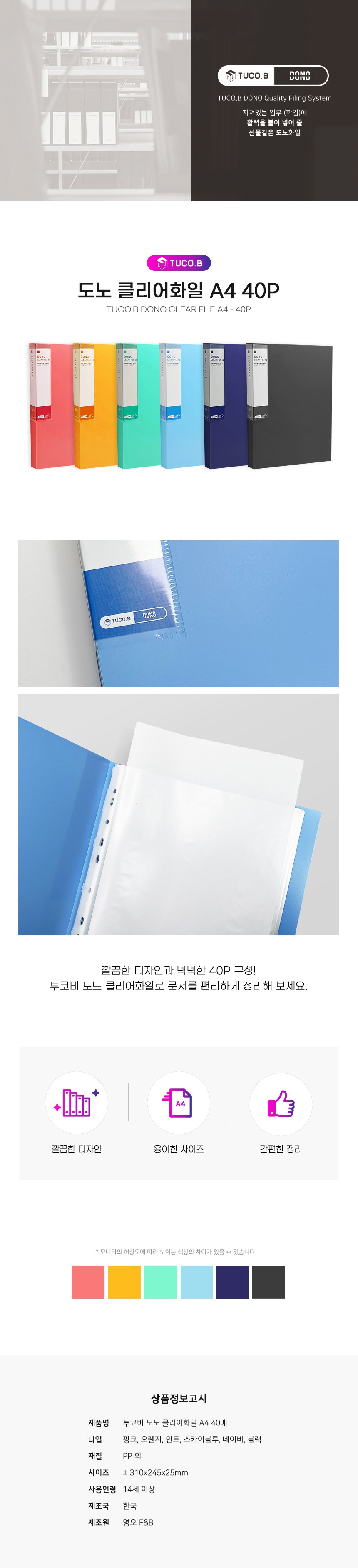 | 품명 및 모델명 | 투코비 도노 클리어화일 A4 40매 민트 2개 | 인증/허가 사항 | 해당없음 |