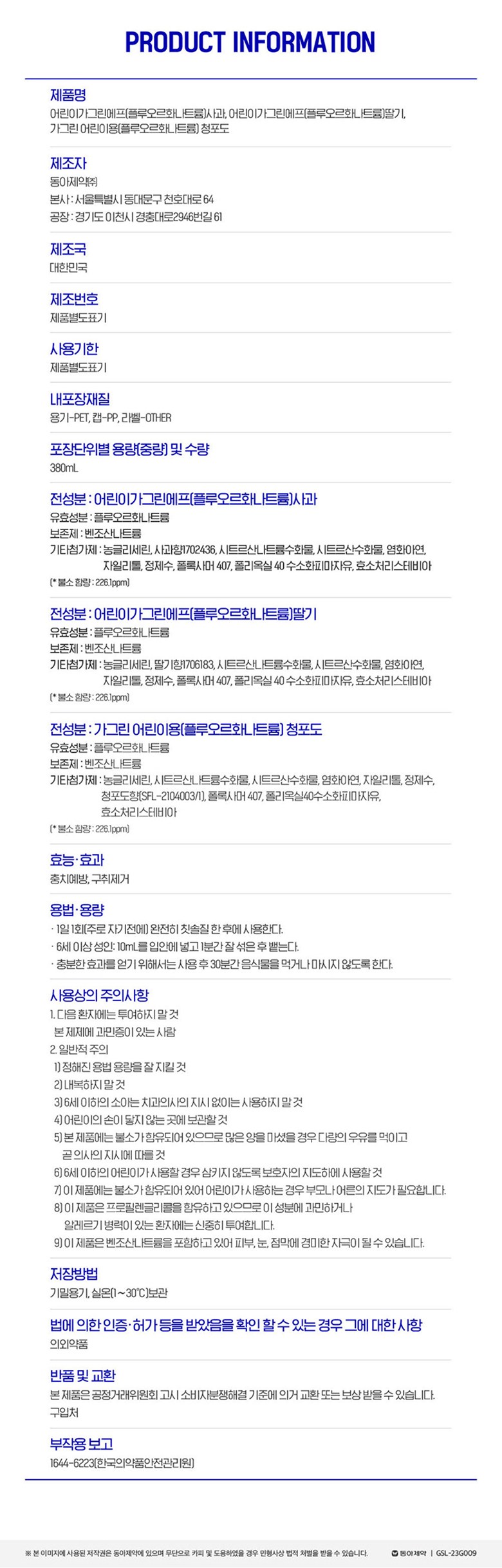 | 제조국(원산지) | 대한민국 | 제조자(수입자) | 동아제약(주) |