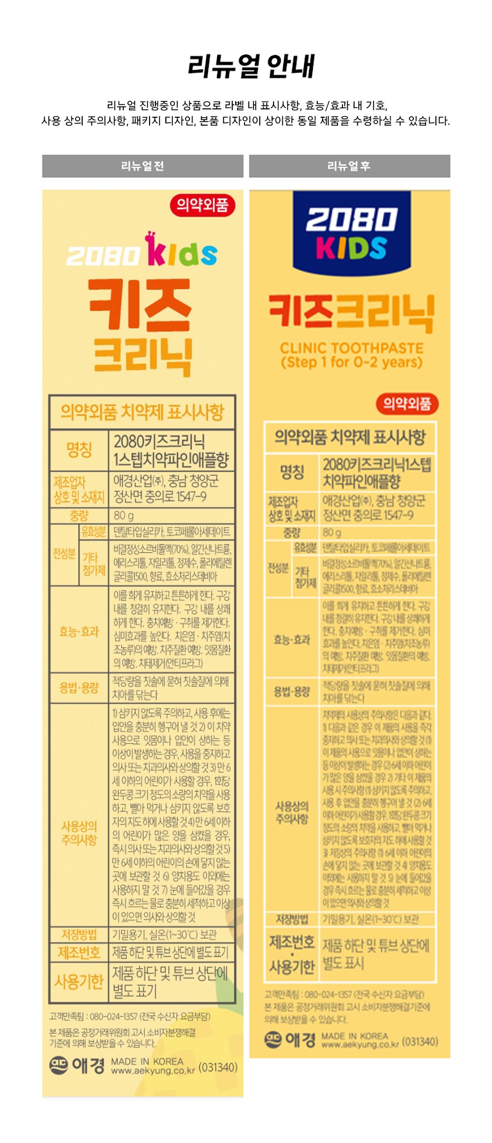 | 품명 및 모델명 | 2080키즈크리닉1스텝치약파인애플향 | 인증/허가 사항 | 의약외품 |