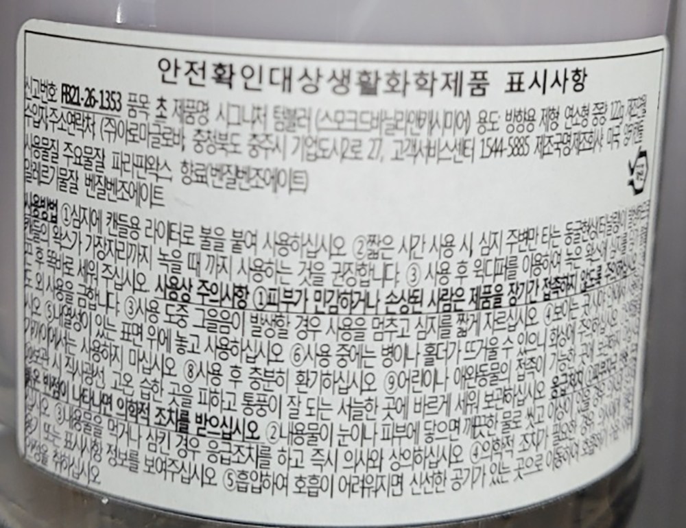 | 품목 및 제품명 | 초 / 시그니처 텀블러 (스모크드바닐라앤캐시미어) | 용도(표백제의 경우 계열을 함께표시) 및 제형 | 방향용 / 연소형 |