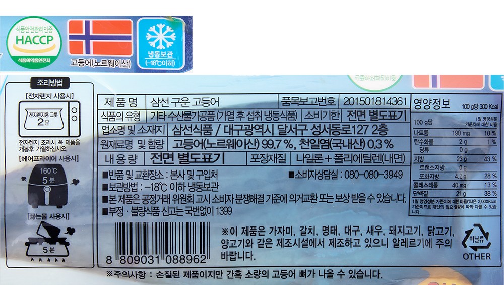 순살 제품이나 간혹 고등어의 뼈가 소량 나올 수 있으니 주의하여 드세요.