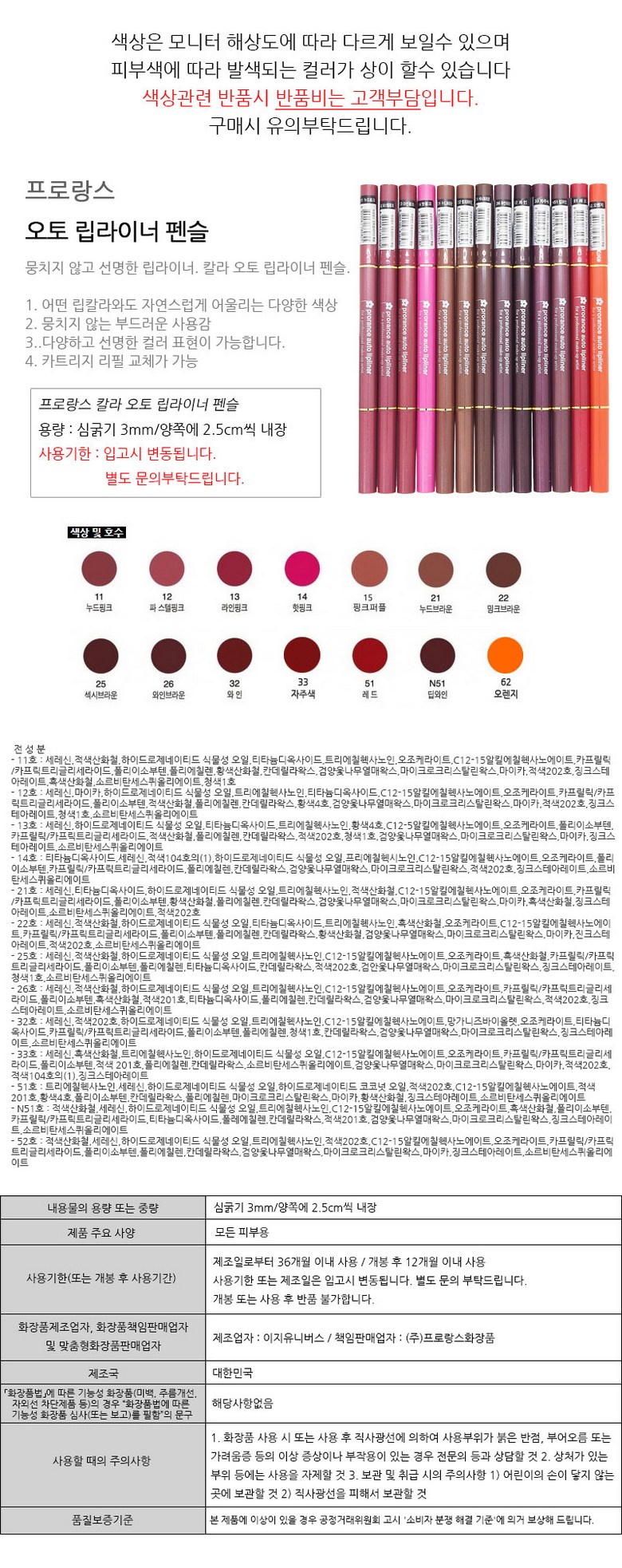 | 화장품제조업자, 화장품책임판매업자 및 맞춤형화장품판매업자 | 상품 상세페이지 참조 | 제조국 | 상품 상세페이지 참조 |