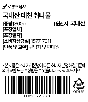 | 품목 또는 명칭 | 국내산 데친 취나물 | 포장단위별 내용물의 용량(중량),수량,크기 | 300gx1개 |