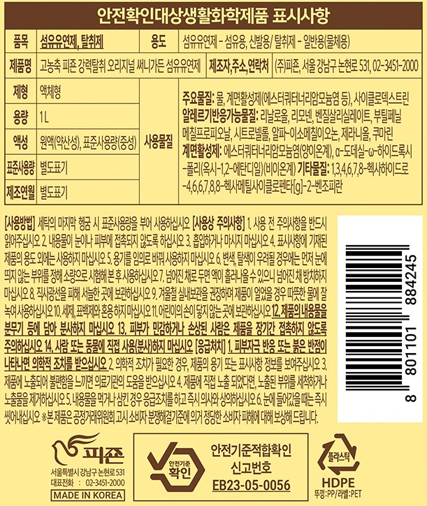 | 품목 및 제품명 | 탈취제,섬유유연제 / 고농축 피죤 강력탈취 오리지널 써니가든 섬유유연제 | 용도(표백제의 경우 계열을 함께표시) 및 제형 | 섬유유연제-섬유용,신발용/탈취제-일반용(물체용)/액체형 |