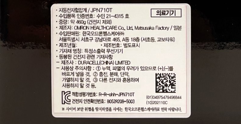 | 품명 및 모델명 | 자동전자혈압계 / JPN710T | 허가∙인증∙신고번호 (의료기기법에 따른 허가∙인증∙신고 대상 의료기기에 한함) | 품목허가번호: 수인 21-4315호 |