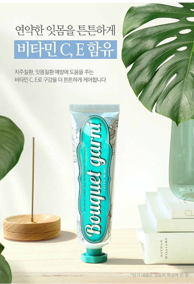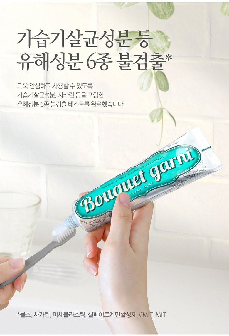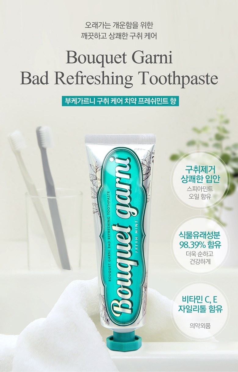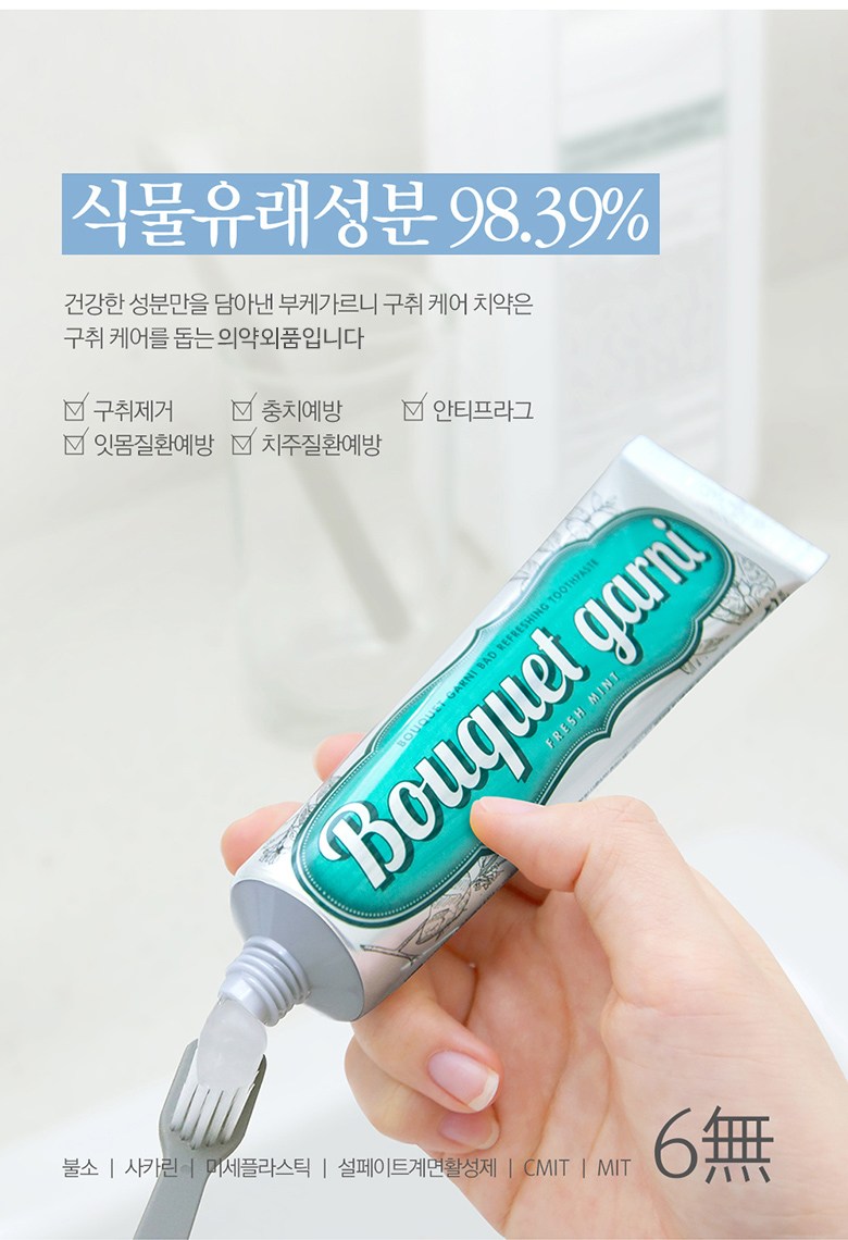 | 품명 및 모델명 | 부케가르니구취케어치약(프레쉬민트향) | 인증/허가 사항 | 의약외품 |