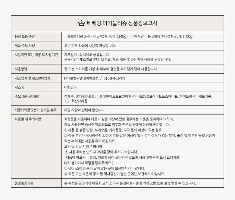 | 용량(중량) | 340g * 10팩 | 제품 주요 사양 | 모든피부용 |