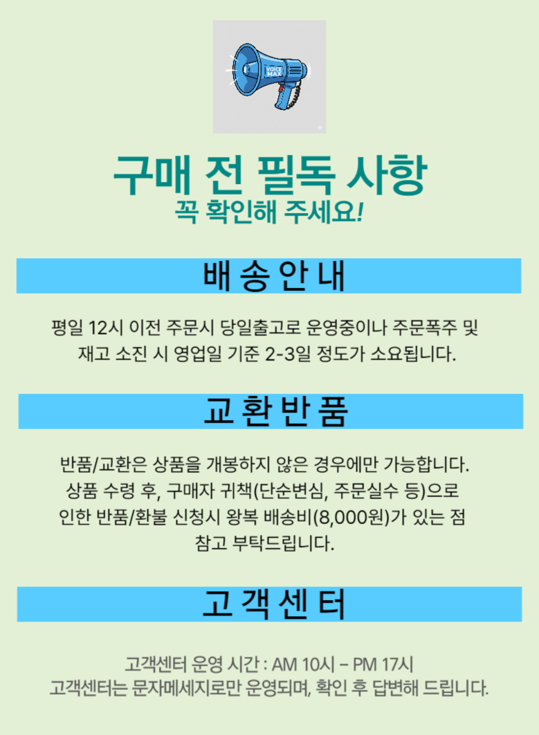 | 교환/반품 비용 (왕복비용) | 10,000원 - 단, 고객 변심의 경우에만 발생 - 도서산간 지역 배송불가 |